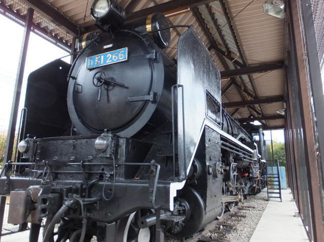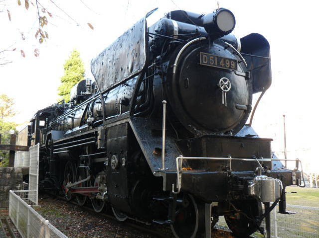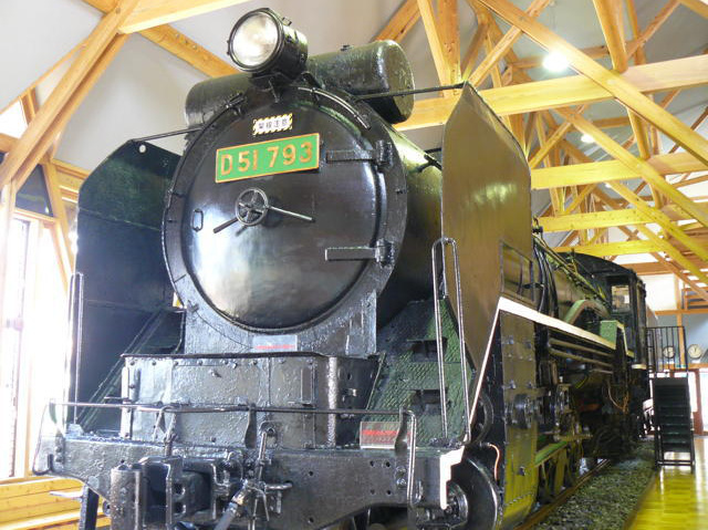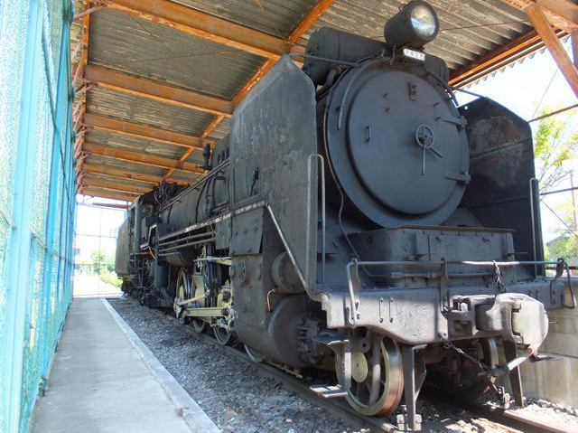 (静岡市、城北公園)私たちD51形蒸気機関者は、D50形の改良機として昭和11年(1936年)から20年(1945年)にかけて、全部で1115両が造られました。日本の代表的な機関車で、通称「デゴイチ」と親しまれました。私は、その中の146番目に名古屋の日本車輌株式会社で生まれました。北海道で働くことになった私は、岩見沢機関区や追分機関区に籍をおき、室蘭本線や函館本線などで37年間もの長い間雪の日も風の日も、いっしょうけんめい働きました。その間走った距離は地球67周に相当する2,675,000キロあまりになります。そんな私も、昭和50年(1975年)12月14日、室蘭本線を最後に引退しました。静岡には、昭和51年2月4日に来ました。みなさん、いつまでも大切にしてくださいね。