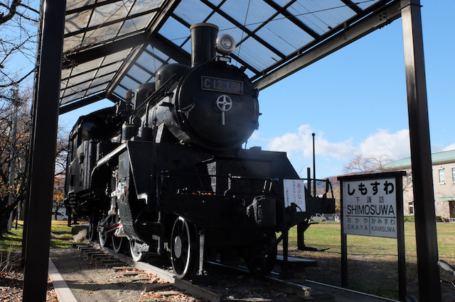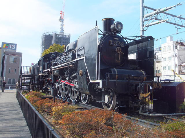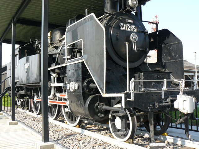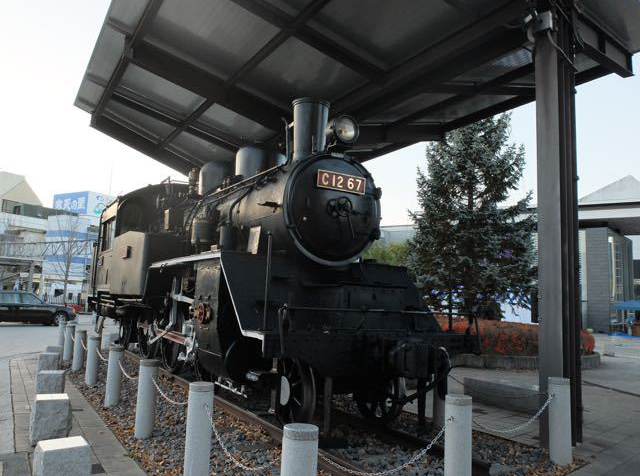 (長野県茅野市 茅野駅前)このC12形式タンク機関車は、昭和7年に誕生し、国内の産業・経済・文化の発展に大きく貢献しました。このC1267は、その67号機です。太平洋戦争中、現在の市内北山地籍にあった諏訪鉄山から軍需用に鉄鉱石が採掘されました。その輸送のため茅野駅まで専用鉄道が敷かれ、田園地帯を蒸気機関車が走りました。そこで活躍したのが、この機関車と同じC12型の機関車でした。市では、この機関車の廃車に際し、昭和48年、かつての歴史を伝える社会的教材として旧国鉄(現JR)から貸与を受けました。そして現在、機関車にふさわしい駅前の交通広場に配置し、この場所で市民の皆さんや遠方の方々に一時を憩っていただけるように展示しています。(付記)この機関車は、昭和8年、茨城県日立製作所で製作され、全国各地に配属され役目を果たしましたが、電気機関車の普及に伴い、昭和48年に廃車となりました。この間40年、約158万km(地球を約39.5周)を走行しました。