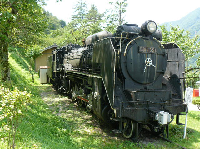 (南木曾町)D51351機関車は昭和15年3月から30有余年の永い間、日本海沿いに、或いは中央西線木曽谷沿いに走り続けて地域の産業経済文化等の発展に多大な貢献をしてきましたが、国鉄の近代化(電化)に伴って廃車となりました。この馴染み深い「デゴイチ」を学校教育に役立てるために、昭和49年5月に国鉄から貸与を受けてこの中央線の旧線上に展示したものです。