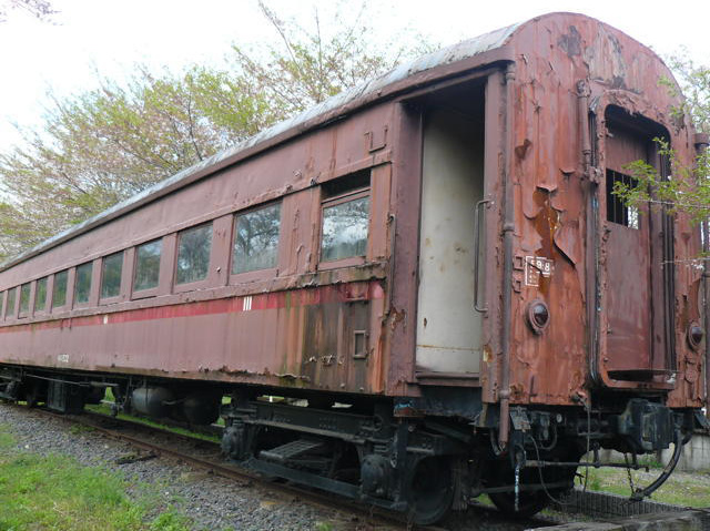 (揖斐川町)オハフ33形車掌室付客車は、昭和14年から昭和18年にかけて346両、21年から24年にかけて35両製造された客車で全国各地で活躍したのち、昭和59年10月樽見鉄道の発足にあたり、当時の国鉄から3両購入しレールバスと同一色に模様替えし、オハフ500形と名付けて運行された。平成2年3月老朽化のため営業運転を終え、そのうちの1両を平成2年5月谷汲村へ寄贈され展示保存している。現在の車体色は、昭和初期の色に復元したもので、赤のラインに白線3本は三等客車を示し、当時は一等車・二等車とあり特別料金が設定されていた。