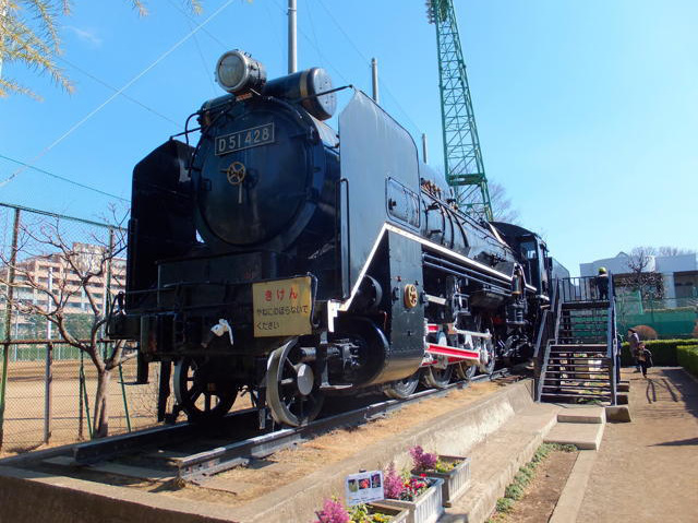 (大田区、萩中自動交通公園)この蒸気機関車は1914年(大正3年)にイギリス・マンチェスターの「ベーヤー・ピーコック社」で製造された物で、1966年(昭和41年)の9月頃まで東武鉄道で最後の蒸気機関車として活躍していました。東武鉄道の厚意により、将来の電化で姿を消す運命にある蒸気機関車を、子供達の教材として区が譲り受けたものです。平成8年9月、老朽化が進み痛みが目立つため、大改修工事を実施いたしました。生まれ変わった蒸気機関車をより一層可愛がって下さい。