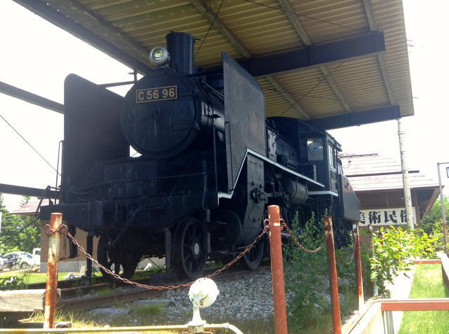 (長野県大町市、西公園)このC56(シゴロク)は国鉄の技術者によって設計され、昭和12年3月、日立製作所にて製造されたものです。その年に、白山、横浜機関区を経て長野機関区へと配属され、県花の産業、経済、文化の発展に活躍されておりましたところ、国鉄の動力近代化により、昭和48年10月、小海線を最後に廃車されるにいたったのです。歴史的36年間、実に地球を43周半も走り続けた、この勇姿を国鉄から貸与をうけ、科学的遺産として、また社会的教材に資するため、ここに展示したのであります。