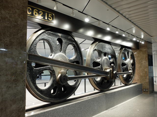 (東京駅地下)"みなさんの足"として親しまれてきた国鉄は、今年で創業100年を迎えました。蒸気機関車は、この歴史とともに歩んできました。第2次世界大戦で戦災を受けた東京駅が修復された昭和23年に、これと時を同じくして誕生したC62形蒸気機関車は、日本復興のエースとして活躍し、世界最高の時速129キロを記録するなど、技術の粋をあつめた”栄光の名機”とうたわれました。このC6215号機は、東海道、山陽、函館本線などをかけめぐり、昭和46年12月解体されるまで、約263万キロ(地球を65.7周)を走り続けました。”鉄道100年”に完成したこの東京地下駅に、同機の動輪をかざり、その歴史をたたえることとしました。昭和47年7月15日日本国有鉄道