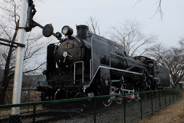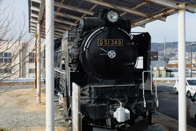(長野県岡谷市、おかや総合福祉センター)D51型蒸気機関車は「デゴイチ」の愛称で親しまれ、昭和13年に登場した日本の代表的機関車です。このD51型蒸気機関車は、昭和15年2月15日「日本製作所笠西工場」で製作され昭和32年10月13日上諏訪機関区に配属。当時日本でオーストラリア国鉄の「アドレフ・ギーゼンリンゲン」氏が開発した「ギーゼル・エゼクター」を取り付け改造した1号機で改造後中央東線で7年間走り続け、この線を走った最後のSLをなり、その後昭和50年12月全国のSLが廃止されるまで、北海道追分機関区に配属、室蘭線で活躍した機関車です。この間、旅客と貨物輸送に尽くし当地方の産業、経済、文化の発展に多大の貢献をしました。岡谷市では、このなじみ深いD51349が廃車されるに際し、市民の科学的遺産として国鉄から貸与をうけ展示しました。