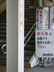 飯田駅のホームには、隣接ホームに乗り換える階段があります。階段脇の「階段をお渡り下さい」の忠告、他の駅の習慣で線路を横切る人がいるのでしょうか。線路を横切る通路はないのですが。 |