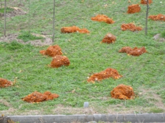 田んぼに点々と捨てられているもの、実は柿の皮。干し柿を作るときにでたものです。 |