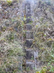 堤防に残る階段状の遺構。川の水位を測る「ものさし」で「量水標」といいます。1段が1尺、左側に1寸の細かい段があり、尺貫法が使われています。しかし段に彫られた文字はローマ数字。ということで昭和33年以前、明治以降に作られたそうです。いずれにしても古いものです。 |