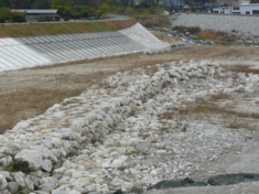 急坂を下って、天竜川に出会います。そこに、江戸時代の遺構がありました。立派な石組みの堤防跡です。 |