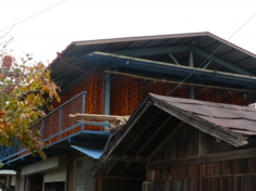 南信州は、干し柿の産地。「市田柿」として全国に知られています。市田は地名で飯田線にも市田駅、下市田駅があります。多くの民家の納屋(別棟)の2階部分に干し柿がつるされていました。 |