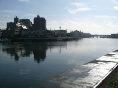 宮の渡しから海の方向を見た風景です。昔はここが海岸線だったと思いますが、今は海岸線がずっと向こうに遠ざかっています。 |