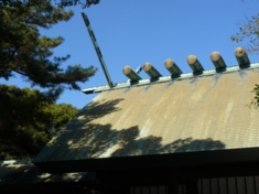 本宮の拝殿の屋根。長く伸びた「千木」と丸太のような「勝男木」がとても印象的。 |