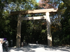 熱田神宮に到着。初めて見た無垢の木造の鳥居。こんな太い柱だと樹齢百年以上の木を使っているのでしょう。 |