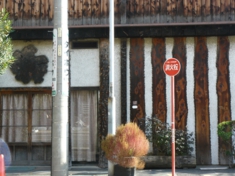 この材木店の正面が立派です。玄関の上や壁の木材の断面の飾りを見ると、特別な銘木を扱っていることがわかります。 |