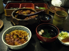 熱田神宮といえば「ひつまぶし」。鰻丼に似ていますが、四等分し、茶碗にいれていただきます。一杯目はそのまま、二杯目は薬味(葱、山葵、海苔)をかけて、三杯目は出し汁をかけて、そして四杯目はお好みでという食べ方をします。美味しくておなかいっぱいになりました。 |