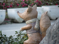 小学校に飾られたきつね。「手ぶくろを買いに」の子狐でしょうか。手袋がかわいいです。 |