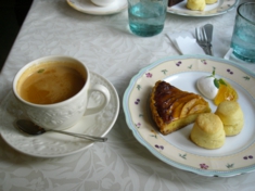 洋館でいただいたスコーン&ケーキセット。古い洋館の客室で紅茶をいただくと、タイムスリップした気分になります。 |