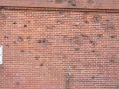 煉瓦壁に残った穴は第二次世界大戦時の空襲で受けた機銃掃射の跡です。戦争の跡を残す貴重な遺産です。 |