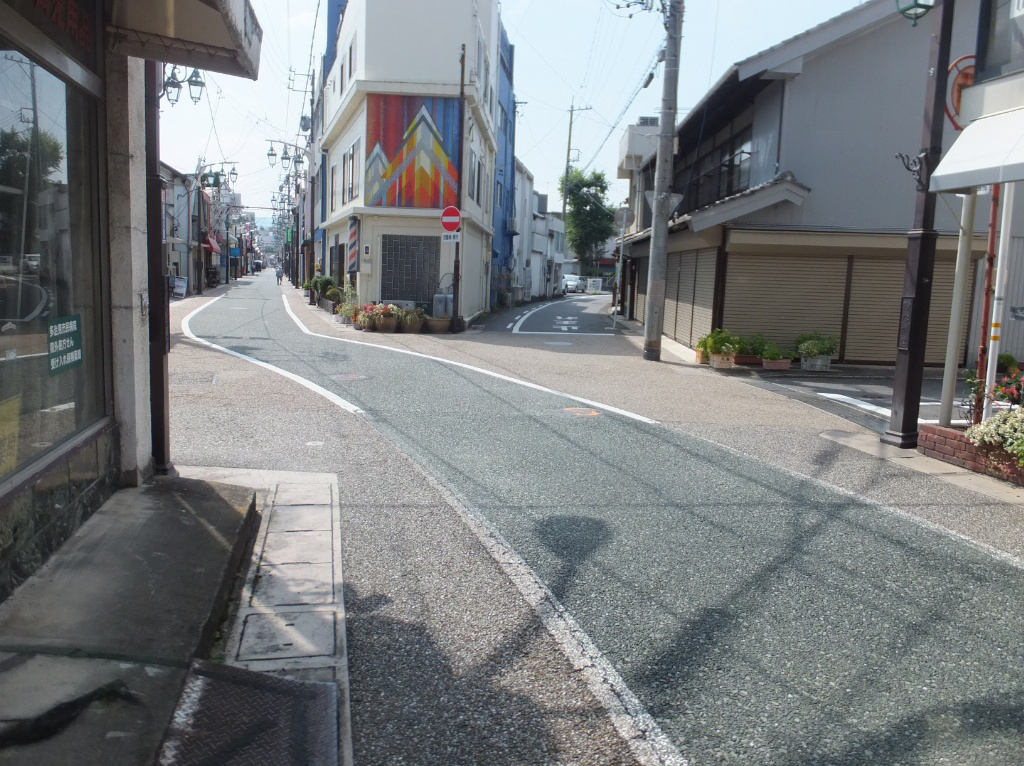 多治見市の長瀬商店街にある下街道と今渡街道の分岐点。直進が下街道で、右斜めの道が今渡街道です。 |