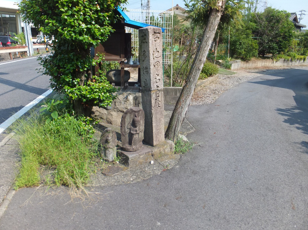 「左 多治見 右 池田 名古屋」の道標。左が今渡街道で、右は下街道に繋がります。なんとこの道標のしたに2体の馬頭観音があります。 |