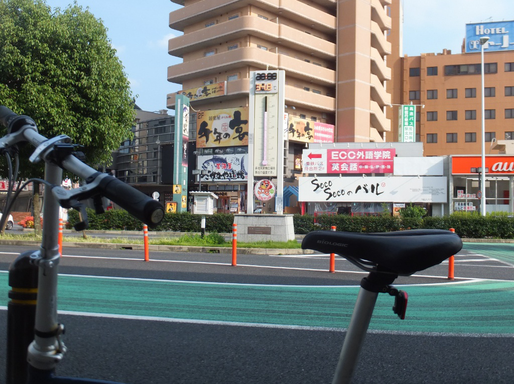 この日は、暑かったので予定を早めて根本駅から多治見駅に輪行で戻りました。多治見駅前の温度計は34.8度を表示していました。 |