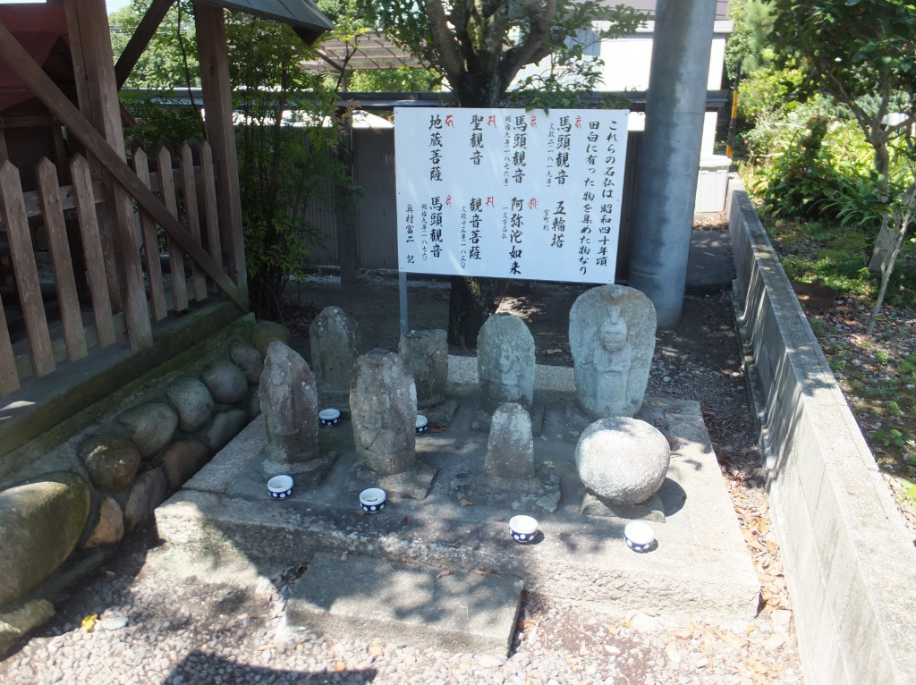 多治見市から可児市に入ると、市街地化して石仏なんか見つからないだろうなと思っていると、公民館の敷地に集められていました。8体の石仏のうち、なんと馬頭観音が3体。結局、二日間で12体の馬頭観音に出会いました。(写真集はこちらにあります) |