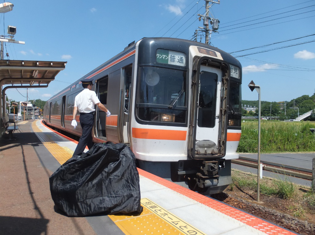 下切駅から根本駅に戻ってきました。気動車は最新のキハ75型でした。手前に見えるのが、輪行袋に入った自転車です。 |