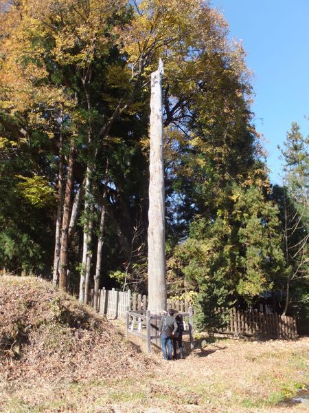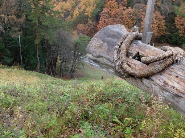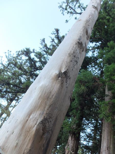 御柱は、御柱祭のときに山から曳いてくるため、一方向が必ず削られて平らになっています。写真では右側が平らです。 |