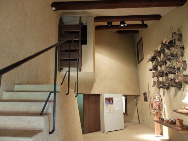 玄関を入って最初に展示されているのは、上社で行われている「御頭祭」という神事のお供えの数々。つまり、イノシシや鹿の首、ウサギの串刺しなどで、建物の斬新さと相まって、ちょっと神秘的です。 |