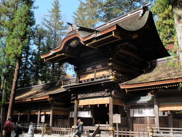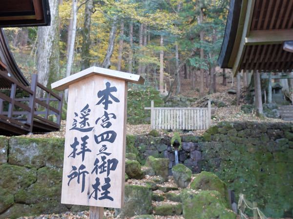 前宮の4本の御柱は近寄れます(触れます)が、本宮の二本の御柱は、少し離れたところから拝みます。 |