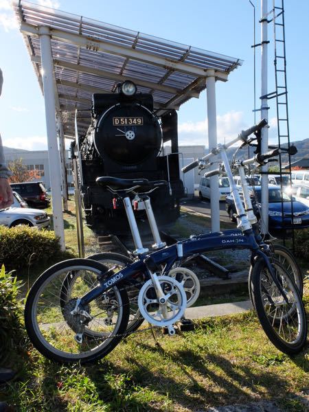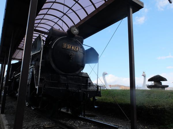 2日目朝一番、湖畔にあるD51に会いに。右奥に写っているのは、遊覧船「おやこはくちょう号」です。この11月末で廃船になるそうです。 |