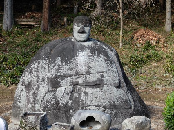 春宮の裏手にある「万治の石仏」。昔、鳥居にしようと石工がノミを入れたら、石から血が流れ出たという言い伝えがあります。それで石仏になったというわけです。大きな石に小さな頭が乗っていて、とてもお茶目です。かの岡本太郎も大好きだったそうです。 |
