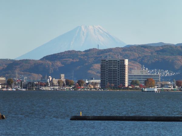諏訪湖畔に出ると、南に富士山が見えました。諏訪湖から富士山が見えるとはビックリ! |