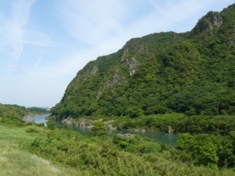 この渓谷を楽しむ「日本ライン下り」という川下り遊覧があります。堤防沿いのサイクリングでもこの渓谷をゆっくりと楽しむことができました。遊覧船に出会ったら、手を振ってみたりしながら。 |