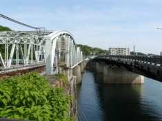 犬山遊園駅手前の木曽川にかかる橋。左の橋は古く1925年からあります。2000年に右にかかる新しい自動車用の橋ができるまで、古い橋には自動車と電車が両方走っていました。特急列車が路面電車のように走る光景に驚いた記憶があります。 |