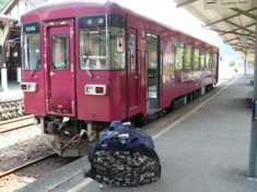 郡上八幡駅に到着。電車と記念写真。車体には「私たちは長良川鉄道を応援します!」の文字。いいね。 |
