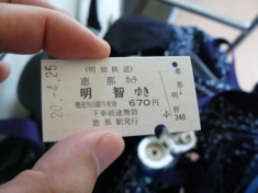 明知鉄道の切符。昔ながらの硬券(硬い切符)で、改札でパッチンとはさみを入れてもらいました。降りる時に、この切符くださいとお願いしたら、裏に「済」マークを入れて、もらうことができました。 |