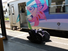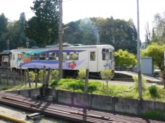 岩村駅に停車中の車両。キレイな花の絵が描かれています。他の車両にもそれぞれ違う花が描かれていました。ちなみに、高校生の帰宅時間帯には2両連結で走っていました。こんなことがわかるのも、ずっと線路にそってポタリングしていたからです。 |