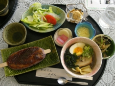 お昼は、山岡駅前の「ヘルシーハウス山岡」で、寒天ラーメンセット(1000円)。麺が細寒天でできたラーメン、黒米で作った五平餅、その他寒天を使った一品料理がセットになっています。ヘルシーながら、お腹はいっぱい。 |