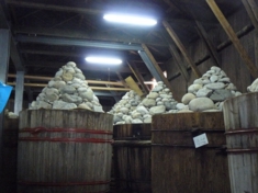見学させていただいた味噌樽。石をお城の石垣のように専門の職人さんが美しく積み上げ、二夏二冬じっくり寝かすそうです。中の味噌は6トン、石が4トンと教えてくれました。 |