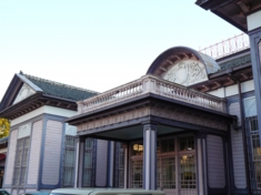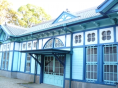 旧公会堂と同時に作られた「旧額田郡物産陳列所」。こちらは一転青色を基調とし、クローバー型の窓が印象的です。大正時代の建築のデザインにはどれも自由さを感じます。 |
