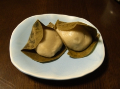 これが「麩まんじゅう」山帰来(サルトリイバラのこと)の葉で包まれています。お餅がフワッとしていて何個でも食べたくなるお饅頭です。 |
