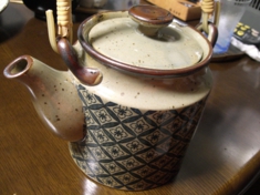 その骨董屋さん、失礼ですが、ガラクタといっていいようなものが所狭しと置いてあります。そこで見つけたこの土瓶。1960年代にこの地で生産され、北欧に輸出されていたものです。デザインが気に入り、購入しました。 |