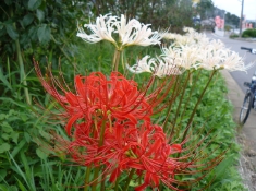街道沿いの彼岸花。赤花と白花のコントラストが美しいです。 |
