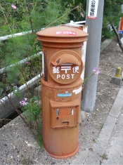 こんな古そうな丸ポストは見たことない。ペンキがはげて、錆びています。よく見ると「日本郵便」のシールが頭に貼られていて現役でした。使われているようには見えないのですが。 |