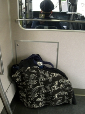 輪行袋に入った自転車を電車に載せたところです。輪行袋はお気に入りの布(鳥獣戯画の模様)を買ってきて制作しました。おしゃれでしょ。 |