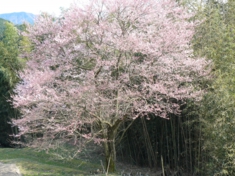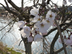 下流に来ると、桜がちらほら。花の付け根がぷっくりと膨らんでいるので、「江戸彼岸」という古くからある桜です。「染井吉野」より少し早く咲きます。 |