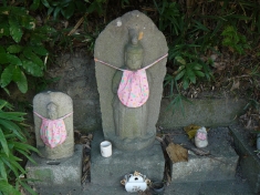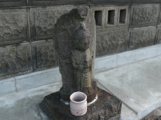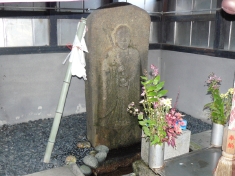 「尻冷し地蔵」 後ろに「正保4年」(1647)と書かれている古いものです。台座の下から清水が湧き出しているので、「尻冷し」と呼ばれているようです。実際に水が湧き出る音がします。 |