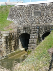 庄内川から堀川への取水口である「庄内用水元杁樋門(もといりひもん)」石組みには明治43年(1910)改築と刻まれていて、これは産業遺産ですね。かつて、この樋門を舟が行き交ったらしいのですが、信じられません。でも二つ孔が開いているのは、その名残なんでしょうね。 |