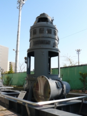 「下水道博物館」に展示されている昭和12年(1937)の「汚水雨水ポンプ」名古屋のような平坦な地形では、下水管に傾斜をつける必要があるので、処理場では大きなポンプで持ち上げる必要があります。これも産業遺産ですね。 |