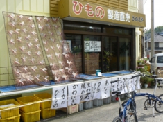 海沿いにはたくさんの干物屋さんがあります。店先に干物が干してある店もあり、食欲をそそられます。 |